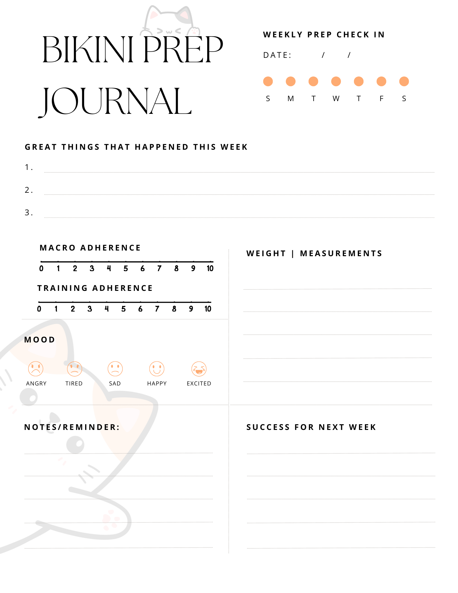 Weekly Bikini Prep Journal | NPC Competition Planner | Digital Download (Editable & Printable)- Cat Theme